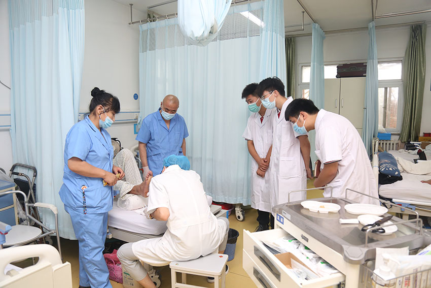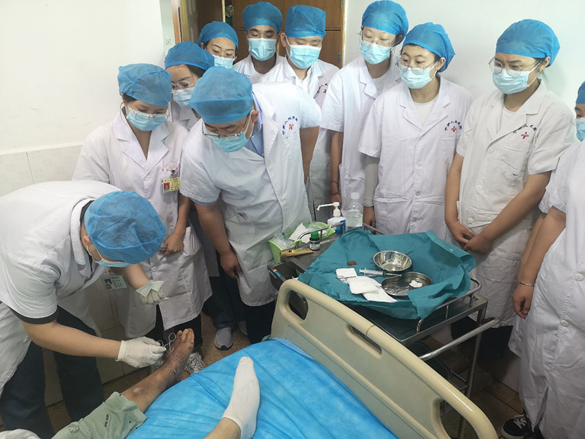 第二天大家繼續(xù)前往達郫都區(qū)人民醫(yī)院進行了交流與學習,享受國務院特殊津貼專家、成都市郫都區(qū)人民醫(yī)院燒傷創(chuàng)瘍科學術帶頭人付子俊教授帶領大家查房并對病人案例一一分析講解;科室主任也特別給濱醫(yī)學子講述了大面積燒傷和深度潰瘍的治療等。