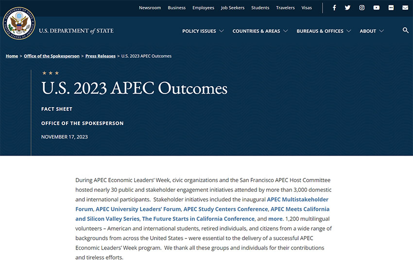 美國國務(wù)院發(fā)布2023 APEC成果報告,灣區(qū)委員會相關(guān)活動列為重要成果