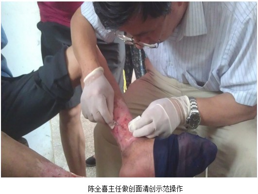 陳全喜主任示范換藥,并詳細(xì)說明了技術(shù)操作方法。這次會診使附院醫(yī)生加深加強了對皮膚原位再生醫(yī)療技術(shù)的認(rèn)識,為再生技術(shù)早日為該區(qū)百姓所用打下了基礎(chǔ)。