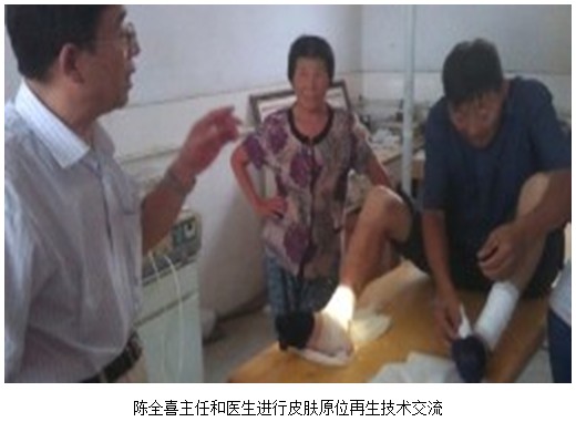 患者是一位年近七旬的老人,三個月前做了下肢靜脈曲張手術(shù),術(shù)后刀口不愈合。檢查患者身體無糖尿病及其他并發(fā)癥。陳主任會診后,和全科的四位醫(yī)生共同觀察創(chuàng)面并現(xiàn)場和醫(yī)生進行了學(xué)術(shù)交流。陳全喜主任說,創(chuàng)面已形成潰瘍創(chuàng)面,邊沿隆起,肉芽組織老化(纖維化)。這種難愈合性創(chuàng)面只有用皮膚原位再生醫(yī)療技術(shù)來進行治療,才能在短時間內(nèi)使創(chuàng)面愈合。陳主任說:“皮膚原位再生醫(yī)療技術(shù),(體細(xì)胞誘導(dǎo)成干細(xì)胞,在原位再生皮膚組織器官)能夠提供細(xì)胞所需的營養(yǎng)成分,并給創(chuàng)面創(chuàng)造一個良好的濕潤環(huán)境,從而激活了創(chuàng)面的潛能細(xì)胞轉(zhuǎn)化為干細(xì)胞。在原位再生皮膚組織,創(chuàng)面以生理性再生愈合。