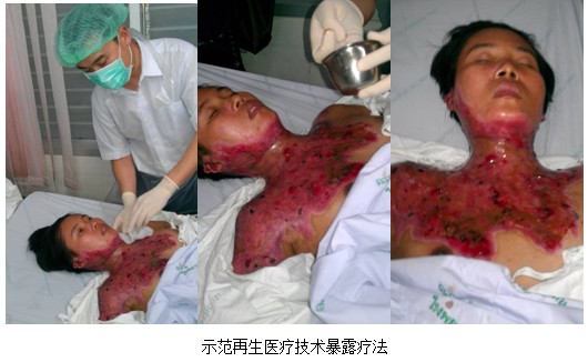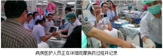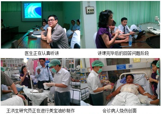 6月19日,美寶團(tuán)隊(duì)驅(qū)車4個(gè)小時(shí)來(lái)到距離曼谷200多公里的南部Kampaeng Pet醫(yī)院意外傷害科室(Accident Ward)的4名醫(yī)生和15護(hù)士進(jìn)行再生醫(yī)療技術(shù)在褥瘡的最新治療進(jìn)展。其中,Dr. Akaropong是美寶的重點(diǎn)醫(yī)生,在2011年進(jìn)行醫(yī)療開(kāi)發(fā)的時(shí)候,該醫(yī)生已經(jīng)開(kāi)始嘗試使用再生醫(yī)療技術(shù)。今年,他所在的科室的大多數(shù)燒傷病人都已經(jīng)開(kāi)始使用該技術(shù)。講課結(jié)束完畢后,為了讓護(hù)士更加規(guī)范的使用再生醫(yī)療技術(shù),王洪生研究員親自為兩位燒傷患者進(jìn)行了規(guī)范的包扎療法和暴露療法臨床操作。參加的醫(yī)護(hù)人員紛紛拿出自己的手機(jī),記錄下整個(gè)操作過(guò)程。在會(huì)診病例時(shí),來(lái)自中國(guó)的專家也吸引了該院內(nèi)科的醫(yī)生過(guò)來(lái)請(qǐng)教并學(xué)習(xí),討論關(guān)于胃腸道出血的再生治療措施。