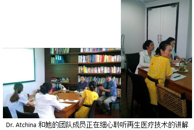 Dr. Atchina介紹說(shuō),她使用美寶燒傷膏在激光治療后的創(chuàng)面上,得到了很好的臨床療效。Dr. Atchina非常想知道再生醫(yī)療技術(shù)聯(lián)合激光治療各類瘢痕或者單獨(dú)治療各類創(chuàng)面的臨床經(jīng)驗(yàn)和實(shí)際操縱方法。王洪生研究員通過(guò)各類不同的臨床對(duì)比圖片,詳細(xì)的展示了再生醫(yī)療技術(shù)在中國(guó)的成功應(yīng)用。Dr.Atchina詳細(xì)地詢問(wèn)了創(chuàng)面及瘢痕治療的各類問(wèn)題,最后表示非常豐富的臨床經(jīng)驗(yàn),非常棒的技術(shù)和產(chǎn)品,我正在做一些臨床對(duì)照研究,希望以后能深層次合作。美寶團(tuán)隊(duì)回應(yīng)非常希望Dr. Atchina能夠總結(jié)出自己的經(jīng)驗(yàn)并且發(fā)表到各類雜志、期刊。今年9月份,美寶會(huì)參加在愛(ài)丁堡舉辦的國(guó)際燒傷大會(huì),類似的機(jī)會(huì)在未來(lái)會(huì)有很多,也希望Dr. Atchina能站在世界的舞臺(tái)上讓更多的人了解這項(xiàng)杰出的技術(shù)和產(chǎn)品。