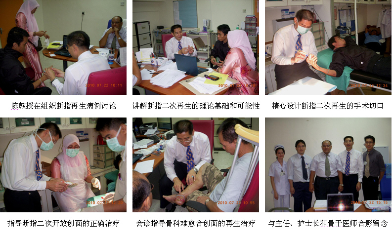 3、7月22日上午,陳永翀教授一行驅(qū)車300多公里,再次應(yīng)邀來到馬來西亞最南端的J. B市政府醫(yī)院骨傷科,與該科的主任、骨干醫(yī)師進(jìn)行斷指再生臨床研究課題的設(shè)計(jì)指導(dǎo)和疑難病例的會(huì)診討論。并解答了大家在過去3個(gè)月中臨床應(yīng)用再生醫(yī)學(xué)技術(shù)遇到的各種問題,收到很好的醫(yī)療開發(fā)維護(hù)、提高和促進(jìn)的效果。