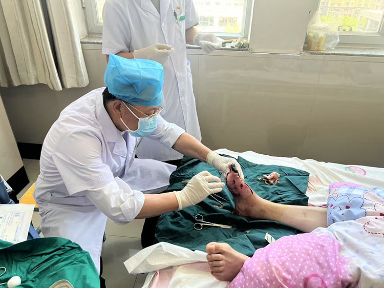 2025年5月14日,中國中西醫(yī)結(jié)合學(xué)會燒傷專業(yè)委員會常務(wù)委員、《中國燒傷創(chuàng)瘍雜志》副總編輯王洪生及醫(yī)療部宋小紅主任,應(yīng)邀到珠海市第五人民醫(yī)院燒傷整形科會診一例嚴(yán)重三度化學(xué)燒傷病人和一例電擊燒傷患者,王洪生教授親自示范深度燒傷創(chuàng)面的清創(chuàng)處理,這次會診受到科室醫(yī)護(hù)和患者的一致好評。