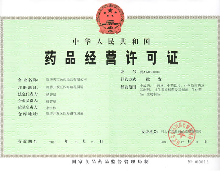 廊坊美寶醫(yī)藥經營有限公司在基地全體員工的共同努力下,在集團董事局的關懷和指導下,于2005年12月13日順利通過了藥品監(jiān)督管理局的藥品經營許可證的驗收檢查。并于2005年12月31日取得藥品經營許可證。這標志著廊坊美寶基地按照美寶國際集國的總體規(guī)劃,向GSP經營方向邁出了成功的第一步。