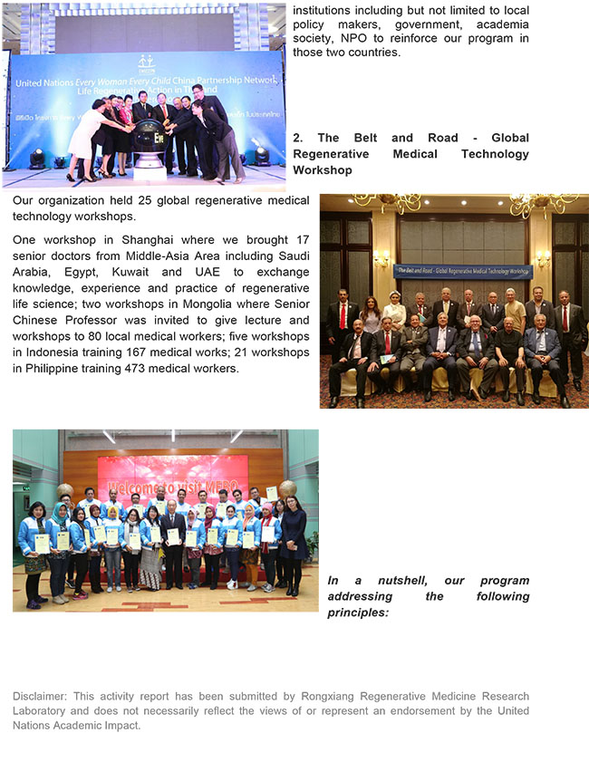 自2016年7月,北京榮祥再生醫(yī)學(xué)研究所成為“聯(lián)合國(guó)學(xué)術(shù)影響“成員來(lái),致力于遵循聯(lián)合國(guó)學(xué)術(shù)影響“消除貧困、可持續(xù)發(fā)展、全民教育“等原則:對(duì)沙特、埃及、科威特、菲律賓、阿聯(lián)酋、印尼等醫(yī)務(wù)工作者進(jìn)行培訓(xùn),2017年,共舉辦了25個(gè)“全球再生技術(shù)研習(xí)班”,總計(jì)約千名一帶一路沿線國(guó)家醫(yī)務(wù)工作者接受了培訓(xùn)。