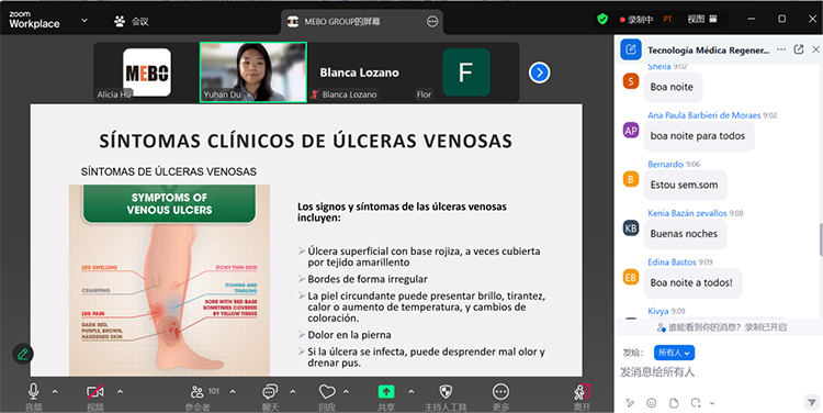 在專題研討環(huán)節(jié),美寶國際技術(shù)部講師杜鈺涵進行了深度學(xué)術(shù)分享,從流行病學(xué)特征、病理生理機制、國際診斷標(biāo)準(zhǔn)到再生醫(yī)療技術(shù)的作用機理與臨床適應(yīng)癥,全方位構(gòu)建了靜脈潰瘍的防治知識體系。特別針對聯(lián)合治療方案優(yōu)化、典型病例分析及長期預(yù)防策略等臨床痛點,提供了基于循證醫(yī)學(xué)的解決方案。參會人員有來自巴西、秘魯、哥斯達黎加等不同拉美國家的醫(yī)生和學(xué)者們多達130人,大家在會議期間踴躍提問,諸如在應(yīng)用再生醫(yī)療技術(shù)期間對于傷口恢復(fù)的作用、慢性創(chuàng)面的病因與再生醫(yī)療技術(shù)的作用機制,慢性創(chuàng)面多病因分析與個體化治療策略等,提出的問題得到逐一解答,獲得與會者一致好評?,F(xiàn)場互動熱烈,充分展現(xiàn)了再生醫(yī)療技術(shù)在慢性創(chuàng)面治療領(lǐng)域的突破性價值與國際認(rèn)可度。