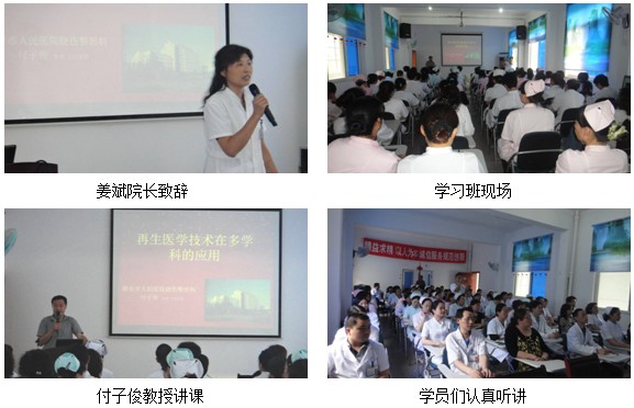 學(xué)術(shù)會議由醫(yī)院醫(yī)教科長劉杰主持,參會人員近70人,均為醫(yī)院的一線醫(yī)護(hù)工作人員。會議首先由姜斌院長致辭,付主任在大家熱烈的掌聲中開始了講座,付主任圖文并茂、深入淺出的講座讓在座的每一位學(xué)員都聽得津津有味,他將再生醫(yī)療技術(shù)的實(shí)用性,經(jīng)濟(jì)行,可操作性做了詳細(xì)的介紹,并且重點(diǎn)介紹了規(guī)范的再生醫(yī)療技術(shù)的換藥方法和原則。姜院長全程聽完了付主任的講座并作會議總結(jié),她表示,再生醫(yī)療技術(shù)是一項(xiàng)非常實(shí)用的技術(shù),是真正適合基層醫(yī)院應(yīng)用的技術(shù)。學(xué)術(shù)會后大家都不愿離開,爭先恐后的提問讓付主任應(yīng)接不暇,付主任坐到大家中間,耐心的一一詳細(xì)解答大家的提問。