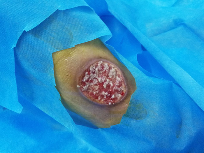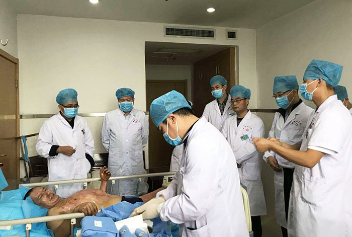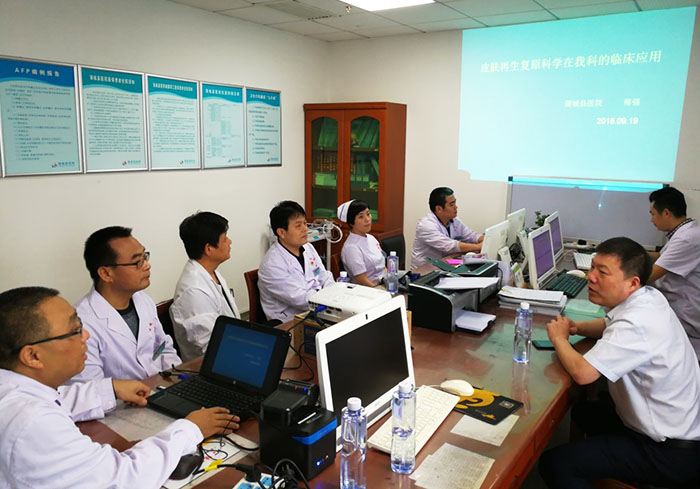 楊智斌總裁此行還會見了西安交通大學附屬西安第九醫(yī)院燒傷科肖厚安主任,該院作為陜西中西醫(yī)結(jié)合學會燒傷專業(yè)委員會主委單位,在再生醫(yī)療技術(shù)的臨床應用中取得了一定成果,特別是在再生療法配合自體微粒皮種植技術(shù)治療面積較大的皮瓣、組織缺損創(chuàng)面的應用方面,解決了傳統(tǒng)燒傷、創(chuàng)面治療缺少皮源這一難題。在肖厚安主任的陪同下,楊智斌總裁還現(xiàn)場觀摩了微粒皮種植術(shù)臨床應用,認真聽取了該科室多年來應用再生醫(yī)療技術(shù)治療的病例總結(jié)。