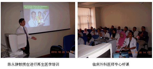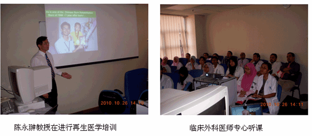 9、10月25日,再生醫(yī)學(xué)院級培訓(xùn)班在Hospital QEH (沙巴州中央醫(yī)院)學(xué)術(shù)報告廳舉辦,燒傷整形醫(yī)師Dr. Izety主持學(xué)術(shù)活動,燒傷整形中心主任Dr. Sergius介紹講課老師和談他參加國際會議認(rèn)識陳教授和了解到燒傷再生醫(yī)學(xué)的過程。來自該院的燒傷整形、普外、創(chuàng)傷骨科和急診科的60多名醫(yī)師、護(hù)士接受了再生醫(yī)學(xué)的培訓(xùn)。培訓(xùn)班還組織了2例燒傷病例的現(xiàn)場操作示范,通過現(xiàn)場示范,大家得以更全面和更直觀地學(xué)習(xí)和掌握再生醫(yī)學(xué)技術(shù)。培訓(xùn)結(jié)束后,該院馬上引進(jìn)和應(yīng)用燒傷再生醫(yī)學(xué)技術(shù)治療燒傷創(chuàng)瘍病人(目  前有1例37%的大面積特重度燒傷的患兒正在接受再生醫(yī)學(xué)治療)。