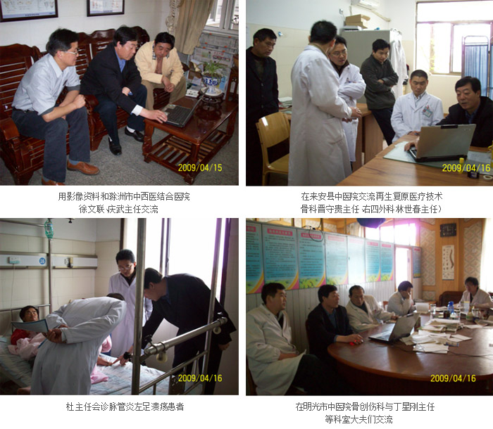 此次杜主任一行分別與滁洲市中西醫(yī)結合醫(yī)院骨創(chuàng)傷科主任徐文聯(lián)主任醫(yī)師、從慶武主任、李華杰主任,來安縣中醫(yī)院外科林世春主任、骨科晉守貴主任,明光市中醫(yī)院骨創(chuàng)科丁星剛主任進行了交流。杜主任利用影像資料向三家醫(yī)院的主任和大夫們介紹了原位再生復原醫(yī)療技術在創(chuàng)瘍治療中的療效和臨床效果,以及再生復原醫(yī)療技術理論實踐―創(chuàng)傷與創(chuàng)傷愈合;介紹原位再生復原醫(yī)療新產品速愈貼的功效以及在5.12特大地震中所發(fā)揮的臨床效果及影響。通過觀看影像資料,使在座的醫(yī)務人員進一步提高了對原位再生復原醫(yī)療技術的認識,并提出希望再生復原醫(yī)療技術的相關產品盡快進入醫(yī)保和新農合用藥目錄,造福廣大創(chuàng)瘍患者。同時,杜主任就來安縣中醫(yī)院舉辦原位再生復原醫(yī)療技術學習班的事宜和張院長進行了交流。希望通過這些工作提高再生復原醫(yī)療技術在皖東的應用水平。
