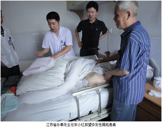 2012年6月29日下午烈日炎炎,應(yīng)德安醫(yī)院的邀請(qǐng)中國(guó)中西醫(yī)結(jié)合學(xué)會(huì)燒傷專(zhuān)業(yè)委員會(huì)常委、中國(guó)燒傷創(chuàng)瘍科技中心臨床醫(yī)療部金黨軍主任,江蘇省辦事處主任宋小紅,工作人員李長(zhǎng)舜一行,為該院進(jìn)行了《皮膚原位再生復(fù)原醫(yī)療技術(shù)在創(chuàng)面處理中的應(yīng)用》系統(tǒng)的學(xué)術(shù)講座,并對(duì)創(chuàng)瘍病人進(jìn)行會(huì)診。