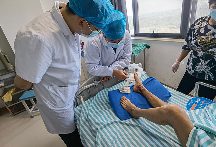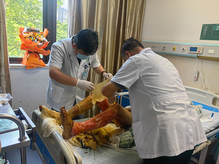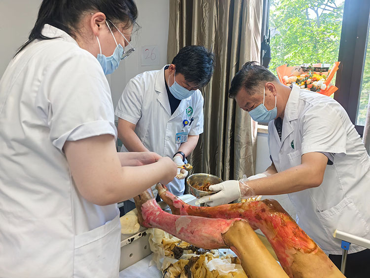 2025年7月8日,中國(guó)燒傷創(chuàng)瘍雜志編委,燒傷創(chuàng)瘍?cè)偕t(yī)療技術(shù)臨床專(zhuān)家張強(qiáng),應(yīng)邀前往鳳陽(yáng)縣人民醫(yī)院,對(duì)一例40%多的大面積燒傷病人和一例糖尿病足患者進(jìn)行臨床會(huì)診,張強(qiáng)主任親自示范再生醫(yī)療技術(shù)創(chuàng)面清創(chuàng)換藥流程,強(qiáng)調(diào)了換藥過(guò)程中的注意事項(xiàng),并與蔣主任交流了綜合治療方案,再生醫(yī)療技術(shù)是中西醫(yī)結(jié)合創(chuàng)面治療的典范,其推廣應(yīng)用將極大造福燒傷及慢性創(chuàng)面患者。