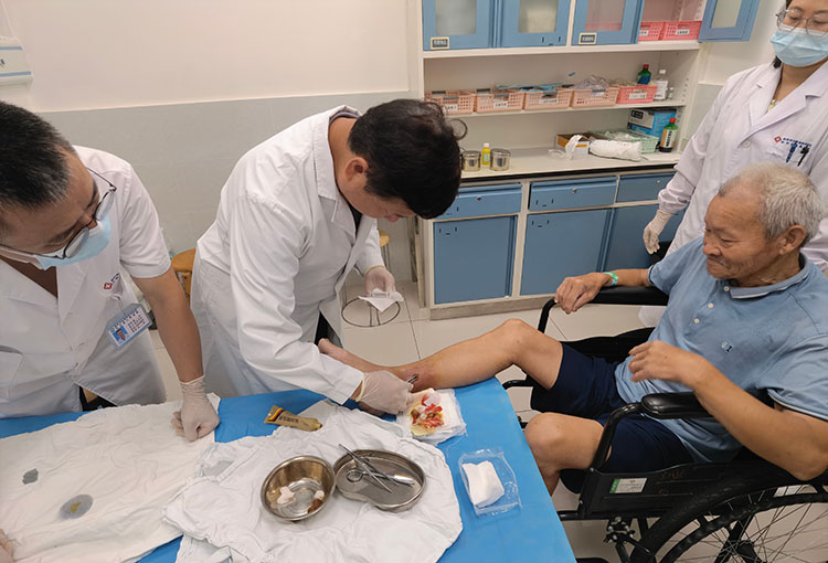 2025年7月1日,中國(guó)中西醫(yī)結(jié)合學(xué)會(huì)燒傷專(zhuān)業(yè)委員會(huì)常務(wù)委員、《中國(guó)燒傷創(chuàng)瘍雜志》副總編輯王洪生,應(yīng)東莞市樟木頭石新醫(yī)院外一科傅桂軍主任邀請(qǐng),來(lái)到該科室會(huì)診一例術(shù)后慢性難愈性創(chuàng)面,王教授給出了創(chuàng)面處理指導(dǎo)意見(jiàn)及手術(shù)方案;下午來(lái)到東莞市濱海灣中心醫(yī)院燒傷整形科,會(huì)診了糖足,壓瘡病人共5例,并指導(dǎo)燒傷整形科主任廖鏘云主任共同參與一例糖足病人的手術(shù)。在王教授的指導(dǎo)下,科室臨床醫(yī)生們學(xué)到了術(shù)前如何快速讓病人止痛及手術(shù)清創(chuàng)等高難度技術(shù)演示,術(shù)后病人非常滿意,本次會(huì)診獲得醫(yī)護(hù)人員的一致稱(chēng)贊!
