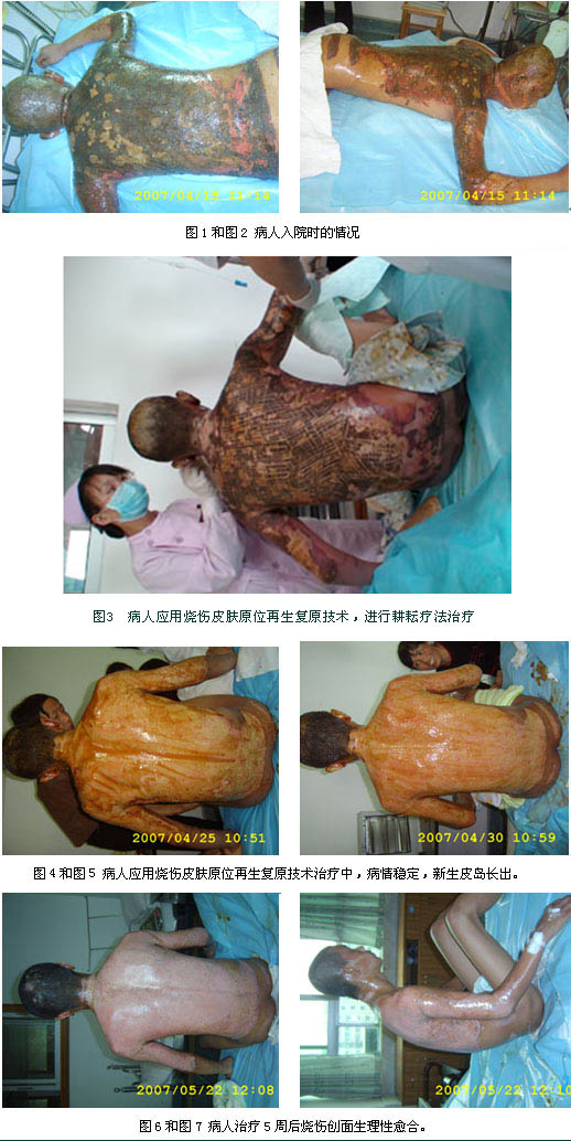2007年4月13日13時(shí)04分,廣州花都中醫(yī)院收入一例成人燒傷,該患者蘇某某,男性,23歲。以“高溫漆料燙傷全身多處伴疼痛1小時(shí)”為主訴急診入院?;颊哂谌朐呵?小時(shí)工作時(shí),不慎被高溫脂類化學(xué)漆料燙燒傷全身多處,現(xiàn)場(chǎng)未作特殊處理,遂到花都中醫(yī)院急診求治,入院查體見:T36.0℃,P82次/分,R20次/分,BP120/90mmHg,神清,急性痛苦面容,頭、面、頸、雙上肢、軀干、臀部皮膚焦黃,炭化,部分表皮撕脫,表皮撕脫處可見創(chuàng)面蒼白,呈蠟白樣,間焦痂樣物,無水皰,無滲出,觸痛遲鈍,面部見表皮破潰,少理脫落,紅白相間,觸痛明顯,雙眼瞼毛燒焦?fàn)?,雙眼粗測(cè)視物無明顯異常,右耳輪呈蒼白色。入院診斷:高溫漆料全身燒傷總面積32%TBSA(深二Ⅱ度11%、淺Ⅲ度21%),特重度燒傷。入院后對(duì)患者創(chuàng)面處理全程應(yīng)用我國(guó)著名生命科學(xué)家徐榮祥教授發(fā)明的燒傷皮膚原位再生醫(yī)療技術(shù),進(jìn)行抗休克、抗感染、營(yíng)養(yǎng)支持、臟器功能保護(hù)等全身綜合治療,并在中國(guó)中西醫(yī)結(jié)合學(xué)會(huì)燒傷專委會(huì)常委、北京燒傷創(chuàng)瘍研究所副所長(zhǎng)、臨床部王洪生主任的全程臨床指導(dǎo)下,患者順利的度過了休克關(guān)、感染關(guān),深Ⅱ度及淺Ⅲ度創(chuàng)面分別于傷后3周及5周左右生理性愈合。該患者的成功救治充分證明了燒傷皮膚原位再生醫(yī)療技術(shù)的顯著臨床治療效果。