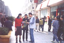 溫州位于浙江南部,甌江從這里流入東海,以“控江帶海,利兼水陸”之勢成為浙南物資集散中心。唐宋時已為對外貿(mào)易港口,1876年被辟為通商口岸,為中國著名僑鄉(xiāng)。溫州五馬街古稱五馬坊,東晉王羲之為永嘉(現(xiàn)溫州)郡守出乘五馬而得名。如今,這里是溫州最為繁華的步行街,每天都有成千上萬的游客從這里經(jīng)過,恰逢十六大召開之際,溫州地區(qū)所有業(yè)務(wù)人員來到這里熱情地向過往行人發(fā)放美寶宣傳品,大家非常認(rèn)真地詢問產(chǎn)品的使用情況。此時此刻,美寶產(chǎn)品的宣傳活動為十六大的勝利召開增添了絢麗的色彩。