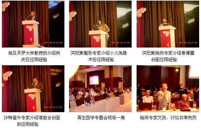 隨后,來(lái)自埃及、突尼斯、沙特、蘇丹的另外8個(gè)臨床專家和教授先后上臺(tái)演講,介紹他們近年來(lái),特別是近3年來(lái)在中國(guó)專家的指導(dǎo)下應(yīng)用再生醫(yī)學(xué)治療燒傷、創(chuàng)傷、潰瘍、供皮區(qū)創(chuàng)面、骨裸露創(chuàng)面、外科感染創(chuàng)面、各科難愈合創(chuàng)面、頜面外科術(shù)后不愈合創(chuàng)面等,應(yīng)用再生醫(yī)學(xué)技術(shù)所取得的神奇臨床效果和經(jīng)驗(yàn)。會(huì)場(chǎng)內(nèi)提問、討論和請(qǐng)教非常踴躍,整個(gè)會(huì)場(chǎng)的學(xué)術(shù)氛圍進(jìn)入到了高潮! 原計(jì)劃2小時(shí)的再生醫(yī)學(xué)專題會(huì)在不知不覺中延長(zhǎng)到了3小時(shí),但是依然還有許多專家意猶未盡,繼續(xù)留在會(huì)場(chǎng)相互交流和討論直到傍晚近7點(diǎn)鐘才離開。