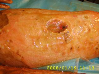 傷后1小時(shí)入院時(shí)情況                                          傷后2周換藥時(shí)情況