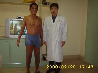 患者入院后,該醫(yī)院院長(zhǎng)劉洪光、副院長(zhǎng)余天智等院領(lǐng)導(dǎo)多次深入病房協(xié)調(diào)病人的救治工作,并在患者廠方交不上醫(yī)療費(fèi)用的情況下,批示醫(yī)院先墊資全力搶救病人,并組織成立以燒傷外科主任李碧錦為首的搶救小組。為確保對(duì)該患者的成功救治,該院于患者入院后即電話請(qǐng)求中國(guó)中西醫(yī)結(jié)合學(xué)會(huì)燒傷專委會(huì)常委、北京美寶燒傷創(chuàng)瘍研究所副所長(zhǎng)、醫(yī)療部王洪生主任會(huì)診,在王主任全程臨床指導(dǎo)下,李碧錦主任帶領(lǐng)全科醫(yī)護(hù)人員夜以繼日的精心為患者治療:創(chuàng)面處理全程采用燒傷皮膚原位再生醫(yī)療技術(shù),結(jié)合抗休克、抗感染、營(yíng)養(yǎng)支持及臟器功能保護(hù)等全身綜合治療,傷后二周,創(chuàng)面壞死組織大部分被清除,出現(xiàn)大量新生肉芽組織,部分皮膚有新皮島生長(zhǎng),傷后四周,深I(lǐng)I度深型創(chuàng)面基本愈合,傷后五周,III度燒傷創(chuàng)面也開(kāi)始有大量皮島生長(zhǎng),創(chuàng)面面積逐漸縮小,第七周后III創(chuàng)面基本愈合。目前,患者已進(jìn)入康復(fù)期,已開(kāi)始用美寶疤痕平及彈力繃帶加壓包扎對(duì)其進(jìn)行康復(fù)期防疤治療。