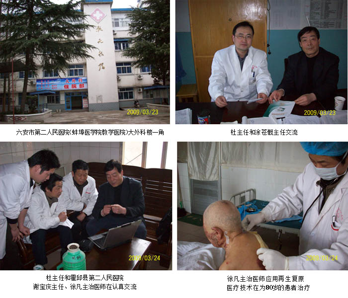 原位再生復(fù)原技術(shù)2009年在安徽革命老區(qū)深入推廣,中國(guó)中西醫(yī)結(jié)合學(xué)會(huì)燒傷專業(yè)委員會(huì)常委、北京燒傷創(chuàng)瘍研究所臨床部研究員、燒傷創(chuàng)瘍專家杜福勤主任應(yīng)邀走訪了安徽省六安市第二人民醫(yī)院(蚌埠醫(yī)學(xué)院教學(xué)醫(yī)院)外科、霍邱縣第二人民醫(yī)院外科。杜主任利用多媒體資料與六安市二院外科涂蒼慨主任、霍邱縣第二人民醫(yī)院外科謝寶慶主任、朱永主任、徐凡主治醫(yī)師進(jìn)行了“再生復(fù)原醫(yī)療技術(shù)在創(chuàng)瘍創(chuàng)面中療效”和“再生復(fù)原醫(yī)療技術(shù)理論與實(shí)踐—?jiǎng)?chuàng)傷與創(chuàng)傷愈合”的交流,交流中涂主任、謝主任、徐大夫?qū)υ偕鷱?fù)原醫(yī)療技術(shù)的神奇療效予以充分肯定,并各自談了自己的臨床實(shí)踐和體會(huì)。對(duì)再生復(fù)原醫(yī)療技術(shù)新產(chǎn)品速愈貼引起極大興趣,并提出臨床開發(fā)建議,希望速愈貼盡快能早日納入醫(yī)保和新農(nóng)合醫(yī)保目錄。造福廣大創(chuàng)瘍患者。