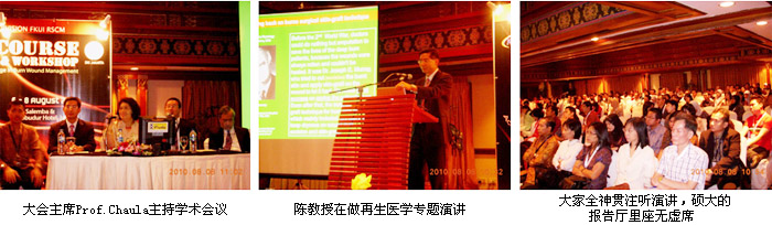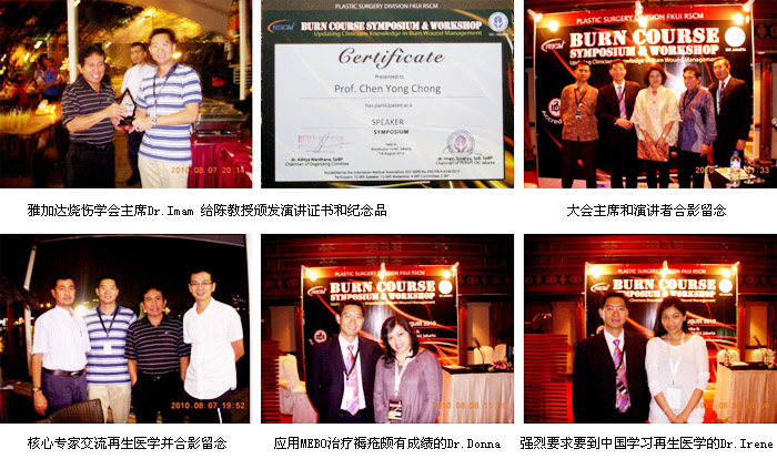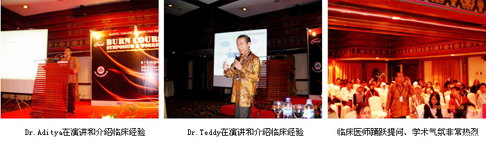 另外,在這次會議期間,除了來自中國的燒傷再生醫(yī)學專家陳教授做了燒傷再生醫(yī)學專題演講外,來自雅加達Cipto醫(yī)院燒傷整形科的Dr. Aditya Wardhana以“Topical Dressing for Burn”為題介紹了自己在燒傷治療方面的臨床經(jīng)驗和體會,特別向大家展示了他2008年到四川進修、學習燒傷再生醫(yī)學技術的親身經(jīng)歷,以及回國后應用燒傷再生療法成功救治的40多例燒傷患者所取得的優(yōu)異效果,很受大家的青睞;還有,來自Cipto 醫(yī)院燒傷整形科的Dr. Teddy在他的發(fā)言中也介紹了自己自2006年起,應用燒傷再生醫(yī)學治療頭面部、雙手、上肢及大腿深度燒傷患者的臨床經(jīng)驗,向大家展示了多例成功病例,從實際應用的角度證明了燒傷再生醫(yī)學的神奇性和優(yōu)越性。這次涉及燒傷再生醫(yī)學的、有國外專家和國內(nèi)專家配合的演講成為大家關注的焦點和討論的熱題,會場氣氛非常熱烈,再生醫(yī)學演講把這次大會的學術氛圍推向了高潮!