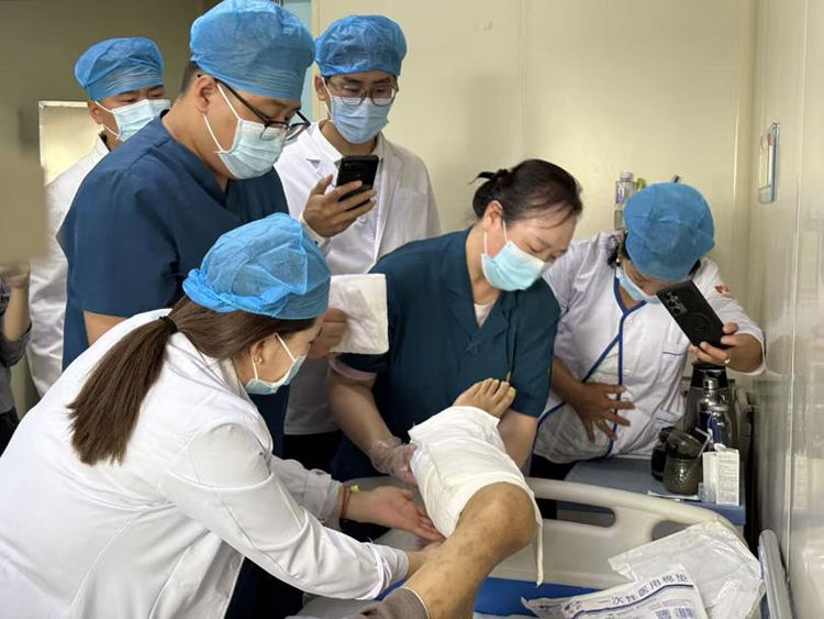 下午,訪問團(tuán)的成員們分批進(jìn)入手術(shù)室,參觀并參與清創(chuàng)、微粒皮種植等手術(shù),每一個(gè)操作細(xì)節(jié)的展示都幫助他們將理論知識(shí)與實(shí)際操作深度結(jié)合,有效提升了其對(duì)再生醫(yī)療技術(shù)相關(guān)手術(shù)操作規(guī)范的理解與掌握程度,為今后在本國(guó)開展同類手術(shù)積累了關(guān)鍵的實(shí)踐經(jīng)驗(yàn)。觀摩活動(dòng)結(jié)束之后,燒傷整形與創(chuàng)面修復(fù)科的醫(yī)生們繼續(xù)帶來了燒傷再生醫(yī)療技術(shù)治療壞死性筋膜炎、燒傷再生醫(yī)療技術(shù)救治糖尿病足臨床實(shí)踐效果的經(jīng)驗(yàn)分享,并在分享結(jié)束后與蒙古國(guó)的醫(yī)護(hù)就兩國(guó)在再生醫(yī)療技術(shù)上的差異和不同經(jīng)驗(yàn)展開了深入交流。通過對(duì)比兩國(guó)在患者體質(zhì)、診療環(huán)境、醫(yī)療資源配置等方面的差異,共同探討了技術(shù)本土化調(diào)整的可行路徑,為再生醫(yī)療技術(shù)在蒙古國(guó)的優(yōu)化提供了重要參考。