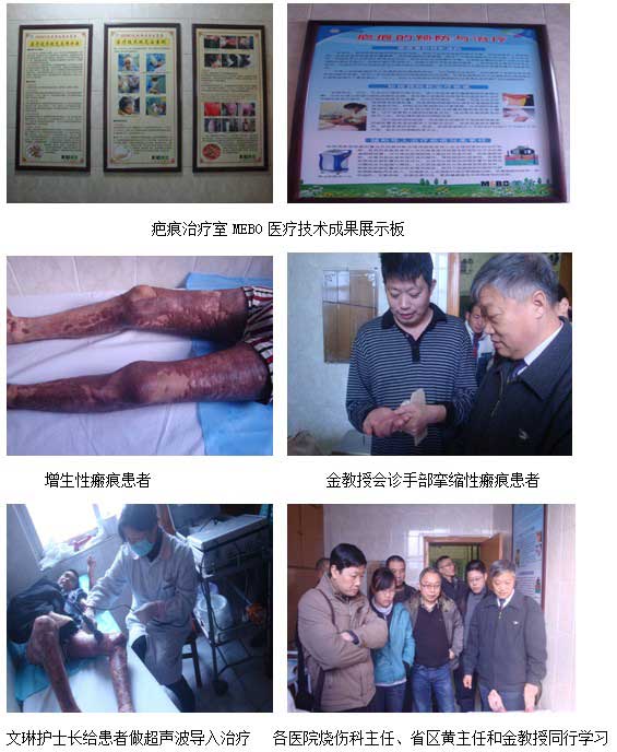 借此年會,金黨軍教授和湖北辦事處黃彥勇主任到MEBO燒傷基地醫(yī)院宜昌市中醫(yī)醫(yī)院燒傷整形科做了回訪工作,并邀約宜都市第一人民醫(yī)院燒傷科徐偉主任、秭歸縣人民醫(yī)院燒傷科史永松主任、興山縣人民醫(yī)院燒傷科張衛(wèi)東主任、五峰縣人民醫(yī)院燒傷科鮮于文濤主任和陳宏宇護(hù)士長同行參觀和學(xué)習(xí)。在疤痕治療室,百忙之中,文琳護(hù)士長熱情接待了我們,也請金教授為做治療的患者進(jìn)行了會診,并操作了美寶疤痕軟膏結(jié)合超聲波導(dǎo)入的治療,同時(shí)肯定了此項(xiàng)技術(shù)所獲得的理想且安全的效果。