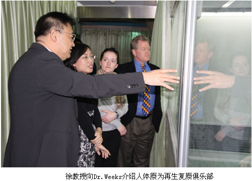 隨后,在徐教授的親自陪同下,來(lái)訪客戶參觀了人體原為再生復(fù)原俱樂(lè)部會(huì)所。徐教授向客人介紹了會(huì)所作為人體原為再生復(fù)原科學(xué)主要研究基地之一,近年來(lái)的建設(shè)成果以及未來(lái)世界范圍內(nèi)的發(fā)展規(guī)劃。會(huì)所世界上獨(dú)霸的技術(shù)、獨(dú)特的風(fēng)格、高檔的設(shè)施以及專業(yè)的技術(shù)實(shí)施隊(duì)伍均令Dr. Weeks一行深深折服。