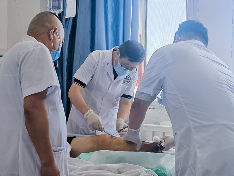 2024年7月22日,應霍邱縣第二人民醫(yī)院燒傷美容整形科王虎主任邀請,《中國燒傷創(chuàng)瘍雜志》編委、燒傷創(chuàng)瘍再生醫(yī)療技術臨床專家張強到該院 會診糖足、慢創(chuàng)病人,并親自為病人處理創(chuàng)面,現(xiàn)場演示了美寶油紗制作及換藥。后續(xù)還給出了綜合治療意見,獲得醫(yī)生及病人家屬一致好評!