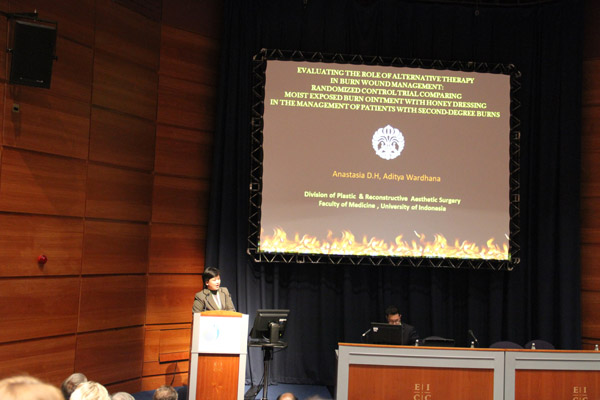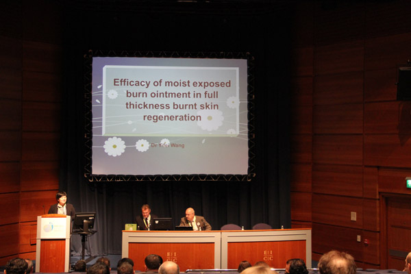 在下午的自由發(fā)言中來(lái)自印度尼西亞大學(xué)的Anastasia Dessy 醫(yī)生以再生醫(yī)療技術(shù)與蜂蜜敷料在二度燒傷創(chuàng)面的對(duì)比進(jìn)行了演講。她通過(guò)兩種方法在創(chuàng)面愈合時(shí)間,愈合質(zhì)量,以及愈合后疤痕情況等等幾個(gè)方面進(jìn)行了全面對(duì)比研究。并得出結(jié)論兩組對(duì)比發(fā)現(xiàn)再生醫(yī)療技術(shù)組愈合時(shí)間明顯縮短同時(shí)患者痛苦小但創(chuàng)面愈合質(zhì)量高,同時(shí)指出,在他們醫(yī)院之前的研究中已有蜂蜜輔料對(duì)傳統(tǒng)SSD的對(duì)比試驗(yàn),結(jié)果顯示蜂蜜輔料組明顯優(yōu)于SSD組,因而其結(jié)論是:MEBO是在創(chuàng)面治療中的最佳選擇。在場(chǎng)與會(huì)專家非常認(rèn)可并接受這種非常嚴(yán)謹(jǐn)?shù)目茖W(xué)對(duì)比試驗(yàn),對(duì)美寶的結(jié)果表示信服,同時(shí)通過(guò)上午的發(fā)言對(duì)再生醫(yī)療技術(shù)已經(jīng)有了一定的了解,因此提出更為深入的問(wèn)題,如到底“美寶”是什么?(美寶的成分)以及其藥理,愈后疤痕治療評(píng)價(jià)等等問(wèn)題。Anastasia醫(yī)生以她的理解一一給予解答。
