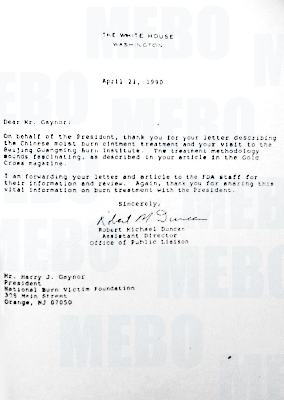1989年的11月,全美燒傷受難者基金會主席哈里•蓋納在中國考察完MEBO/MEBT回到美國后,不僅通過媒體對徐榮祥的新燒傷治療技術進行了介紹,而且向美國政府官員和老布什總統(tǒng)做了匯報,希望得到美國政府的重視和支持。當時的白宮公共關系辦公室主任助理代表布什總統(tǒng)致函蓋納,表示對此深感興趣,并介紹給有關部門;美國駐華大使李杰明,根據(jù)美國官方要求,正式致函中華人民共和國衛(wèi)生部時任司長,表明了合作意向……