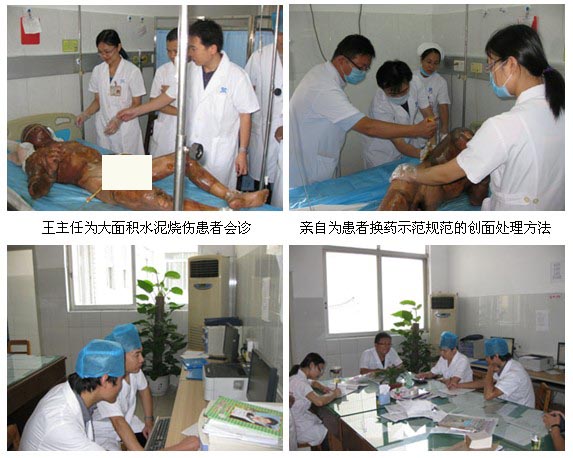 在培訓(xùn)基地揭牌儀式后,王主任在燒傷外科余暢主任的陪同下深入燒傷病房為該例大面積燒傷患者會(huì)診?;颊呤?011年8月30日早上7點(diǎn)該醫(yī)院外三科收治的一名水泥全身燒傷總面積達(dá)80%TBAS(深I(lǐng)I度~淺III度)的成人大面積深度燒傷。我主任在進(jìn)行認(rèn)真查房問(wèn)診之后,指導(dǎo)該醫(yī)院燒傷外科的醫(yī)護(hù)人員應(yīng)用規(guī)范的燒傷皮膚原位再生復(fù)原技術(shù)救治病人,并與余暢主任及燒傷科醫(yī)生一起制定了詳細(xì)治療方案。