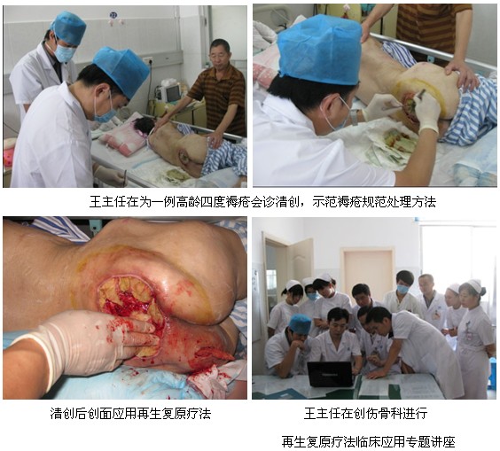 接下來(lái),王主任在該醫(yī)院燒傷外科為一例大面積燒傷患者會(huì)診后,又應(yīng)創(chuàng)傷骨科況主任的邀請(qǐng),為該科收治的一名高齡四度褥瘡患者進(jìn)行了會(huì)診,并親自為該例褥瘡會(huì)診清創(chuàng),示范規(guī)范的創(chuàng)面處理方法。示范手術(shù)結(jié)束后,王主任又應(yīng)邀為創(chuàng)傷骨科醫(yī)護(hù)進(jìn)行了“再生復(fù)原療法在難愈性創(chuàng)面治療新進(jìn)展”專題講座,并重點(diǎn)講解了再生復(fù)原療法在褥瘡、糖尿病足及骨科創(chuàng)瘍的創(chuàng)面規(guī)范化處理及全身綜合治療要點(diǎn),同時(shí)還講解了電擊傷及手指再生等相關(guān)臨床治療方法,講解完后,醫(yī)生均表示王主任這次的到來(lái)讓他們受益匪淺,他們從今天起一定會(huì)在臨床上使用原位再生療法造福患者。