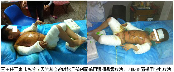 病例一.患兒XX,男,4歲,以“沸水燙傷全身多處伴疼痛半小時”為主訴于2011年4月11日急診入院。入院時查體:T:37.4℃,P:88次/分,R:20次/分,神志清楚,急性痛苦病容,四肢、前后軀干、臀部及會陰部散在大小不等的水皰,部分創(chuàng)面腐皮脫失,基底紅白相間,少滲出,感覺鈍。入院診斷:沸水全身燙傷40%TBSA,深I(lǐng)I度,特重度;患者入院后對其創(chuàng)面處理全程采用燒傷皮膚原位再生復(fù)原技術(shù),結(jié)合全身綜合治療,經(jīng)過對其近1個月的精心救護(hù),患兒順利渡過休克關(guān)、感染關(guān),創(chuàng)面愈合而出院。