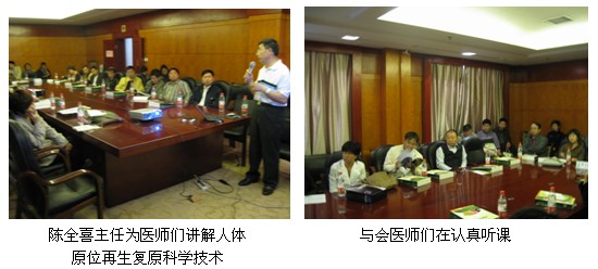 2011年5月21日上午,人體再生復(fù)原科學(xué)技術(shù)培訓(xùn)班在河南省鶴壁市??h大伾山賓館舉辦,來自??h人民醫(yī)院外科、骨科、胸外科、腫瘤科、急診科,??h婦產(chǎn)科醫(yī)院,??h第二人醫(yī)院外科、骨科共83人參加了此次培訓(xùn)。其中主任醫(yī)師8名,副主任醫(yī)師21名,主治醫(yī)師和住院醫(yī)師共54名。北京榮祥再生醫(yī)學(xué)研究所臨床部專家陳全喜主任親自為??h三個醫(yī)院的醫(yī)師進行了人體再生復(fù)原科學(xué)技術(shù)的專題培訓(xùn)。