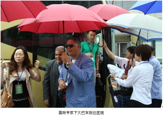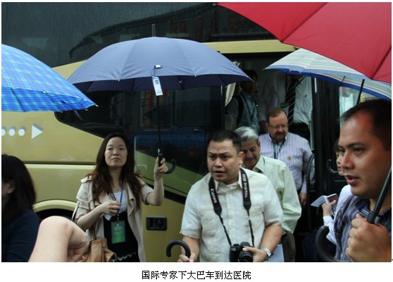 24日9時許,國際專家們乘坐大巴車到達南通市第三人民醫(yī)院,此時天上下起小雨,但專家們的參觀熱情依然高漲。
