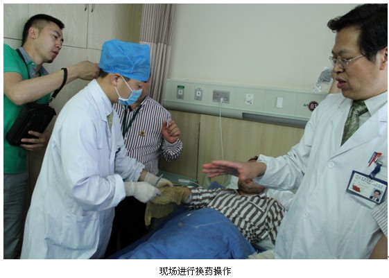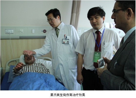 隨著院方引導(dǎo)員的指引,專家們來到了此次參觀的重點部分——燒創(chuàng)傷科室,在此接待的是燒傷科的趙主任。趙主任首先介紹了美寶再生產(chǎn)品在醫(yī)院的使用情況,隨后將專家們帶進住院病房,分別通過一個燒傷病例和一個褥瘡病例展示了美寶產(chǎn)品在治療燒傷創(chuàng)瘍領(lǐng)域的獨特功效。第一個病例是一個深二度燒傷病人,趙主任展示了經(jīng)過一段時間美寶燒傷膏的使用病人的恢復(fù)情況,并現(xiàn)場對國際專家并行了美寶燒傷膏換藥的操作示范,使專家團對美寶產(chǎn)品有了更加全面和更加深入的認識。