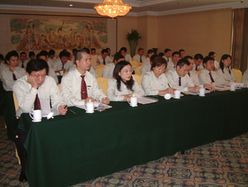 5日上午8:30會(huì)議正式開始,會(huì)議由集團(tuán)總裁領(lǐng)導(dǎo)班子總裁楊智斌主持并首先作工作報(bào)告,楊總總結(jié)了主市場(chǎng)3-6月的工作情況,指出前段時(shí)間市場(chǎng)上出現(xiàn)的一些問題和召開此次大會(huì)的重要性,并指出此次大會(huì)不喊口號(hào)、不走形勢(shì),要實(shí)實(shí)在在的落實(shí) “全力出擊”實(shí)施方案,把各項(xiàng)計(jì)劃指標(biāo)落到實(shí)處,為下一步的工作做好規(guī)劃和部署。隨后各省區(qū)CEO也逐一發(fā)言,每個(gè)人總結(jié)了3-6月份的任務(wù)完成情況,楊總針對(duì)每個(gè)省區(qū)的情況做了相應(yīng)點(diǎn)評(píng)。