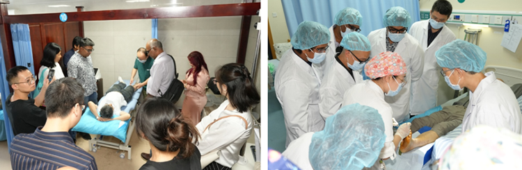 9月16日,代表團(tuán)首站訪問湖南中醫(yī)藥大學(xué)第二附屬醫(yī)院。醫(yī)院黨委副書記游柏穩(wěn)代表院方致歡迎辭。隨后,皮膚中心創(chuàng)面修復(fù)科副主任田毅與侯玉潔醫(yī)生分別就典型病例進(jìn)行了分享,以深入淺出的方式介紹了再生醫(yī)療技術(shù)在創(chuàng)面管理中的應(yīng)用機(jī)制,使代表團(tuán)對(duì)該技術(shù)有了更深入的理解。分享結(jié)束后,代表團(tuán)前往針灸推拿康復(fù)中心,參觀并親身體驗(yàn)了針灸、閃罐等傳統(tǒng)中醫(yī)治療方法。隨后,代表團(tuán)走進(jìn)創(chuàng)面修復(fù)科病房,現(xiàn)場觀摩了應(yīng)用再生醫(yī)療技術(shù)為糖尿病足及放射性皮炎患者規(guī)范換藥的全過程,并就放射性皮炎在創(chuàng)面處理中的難點(diǎn)與關(guān)鍵治療環(huán)節(jié)進(jìn)行了交流。參觀環(huán)節(jié)結(jié)束后,雙方專家再度座談,圍繞慢性創(chuàng)面治療的最新進(jìn)展、中馬兩國醫(yī)療體系的差異等議題展開了深入討論。