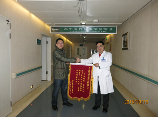 為感謝湘雅三醫(yī)院燒傷科開拓創(chuàng)新,大膽采用人體再生復原技術(shù)根治肛瘺術(shù)后感染創(chuàng)面,患者周某特制錦旗兩面分別送給賀全勇教授和郭夢茜醫(yī)生。