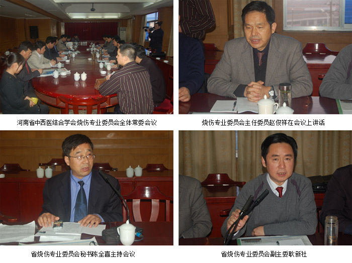 河南省中西醫(yī)結(jié)合學(xué)會(huì)燒傷專業(yè)委員第一次常委會(huì)議于2009年3月21日在河南省南陽市京達(dá)賓館召開。參加會(huì)議的來自河南省的17個(gè)地市的常委、專家,他們分別是::劉潤文名譽(yù)主任委員(河南宏力醫(yī)院主任)、趙俊祥主任委員(河南大學(xué)附屬南石醫(yī)院院長)、惠雷副主任委員(河南大學(xué)第一附屬醫(yī)院燒傷科主任)、耿新社副主任委員(鄭州市新密市中醫(yī)院院長)、王秉真副主任委員(漯河市第一人民醫(yī)院燒傷科主任)、李華強(qiáng)副主任委員(河南大學(xué)人民醫(yī)院副院長)、李天宇副主任委員(河南大學(xué)附屬南石醫(yī)院燒傷科主任)、陳全喜秘書長、趙俊國秘書長、陳振宇常委(許昌市燒傷醫(yī)院院長)、孫久孟常委(安陽市151醫(yī)院燒傷科主任)、蔡玉娥常委(商丘市第一人民醫(yī)院燒傷科主任)、崔正軍常委(鄭大一附院燒傷整形美容科主任)、李志剛常委(洛陽市中心醫(yī)院燒傷科主任)、李長明常委(周口燒傷醫(yī)院院長)、張彬宇常委(新鄉(xiāng)市第二人民醫(yī)院燒傷科主任)、毛登豐常委(濮陽市中醫(yī)院燒傷科主任)、邢偉常委(焦作市中醫(yī)院燒傷外科主任)、趙俊國常委(鶴壁市第二人民醫(yī)院燒傷外科主任)、婁季鶴常委(鄭州市第一人民醫(yī)院燒傷科主任)、李志倩常委(河南大學(xué)附屬南石醫(yī)院燒傷科護(hù)士長)。