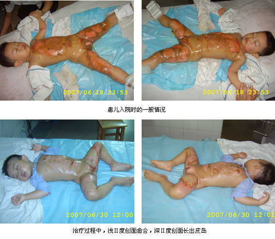 2007年6月18日下午3時(shí),廣州花都中醫(yī)院燒傷外科急診收入一例小兒大面積燒傷患兒。該患兒男性,1歲11個(gè)月。以“熱液燙傷全身多處并疼痛滲液1小時(shí)”為主訴急診入院。入院時(shí)體查示:左側(cè)面頸部、胸前壁、腹壁、會(huì)陰部、雙側(cè)大腿創(chuàng)面可見散在大小不等的水皰,部分腐皮破潰,創(chuàng)基紅白相間或蒼白色,滲液較多,觸痛明顯。入院診斷:熱液全身多處燙傷Ⅱ-Ⅲ度總面積28%TBSA(淺Ⅱ度8%、深Ⅱ度15%、淺Ⅲ度5%);患兒入院后該院立即請(qǐng)求中國中西醫(yī)結(jié)合學(xué)會(huì)燒傷專委會(huì)常委、北京燒傷創(chuàng)瘍研究所副所長、臨床研究部主任王洪生為患兒會(huì)診。王主任到達(dá)該院并查看患兒后、立即與燒傷外科主任雷震及主管醫(yī)生萬志強(qiáng)共同為患兒制定了適宜的救治方案,即對(duì)患兒創(chuàng)面處理采用外涂美寶濕潤燒傷膏行濕潤暴露療法,全身治療采用抗休克、抗感染、營養(yǎng)支持及臟器功能維護(hù)等綜合措施。經(jīng)二十余天積極有效的治療,患兒平穩(wěn)渡過了休克關(guān)、感染關(guān),左側(cè)面頸部、胸腹部、右側(cè)大腿淺Ⅱ度、深Ⅱ度及左側(cè)大腿、會(huì)陰部、陰莖處淺Ⅲ度創(chuàng)面已基本生理性愈合。