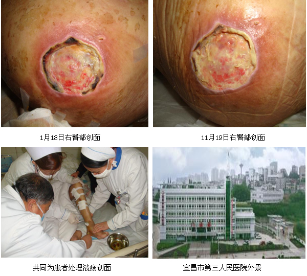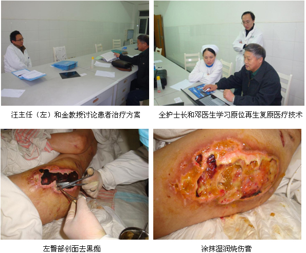 2010年12月17日至12月19日,中國(guó)中西醫(yī)結(jié)合學(xué)會(huì)燒傷專業(yè)委員會(huì)金黨軍教授在對(duì)宜昌市各醫(yī)院走訪期間,應(yīng)該院外科汪長(zhǎng)青主任和全麗麗護(hù)士長(zhǎng)的邀請(qǐng),對(duì)剛?cè)朐旱囊晃荒X梗塞偏癱老年患者多發(fā)性褥瘡創(chuàng)面進(jìn)行了臨床換藥指導(dǎo)。該患已79歲高齡,金教授見到患者時(shí),背部褥瘡結(jié)黑痂,左臀部形成空腔,這兩處面積較大,伴有惡臭;另右臀部、膝蓋、左小腿及左腳均有潰瘍創(chuàng)面,并伴低蛋白血糖和疝氣。在全護(hù)士長(zhǎng)等護(hù)士的陪同下,金教授為患者耐心地清洗周邊的創(chuàng)面,剪去黑痂,空腔上使用濕潤(rùn)燒傷膏油紗條填塞,并采用藥膏和創(chuàng)瘍貼結(jié)合換藥,金教授通過兩個(gè)多小時(shí)實(shí)際操作,詮釋了再生醫(yī)療技術(shù)對(duì)創(chuàng)面的處理要點(diǎn),隨后金教授結(jié)合多媒體材料為現(xiàn)場(chǎng)的醫(yī)護(hù)人員講解了再生醫(yī)療技術(shù)在燒傷、創(chuàng)瘍、褥瘡、潰瘍等創(chuàng)面的應(yīng)用,講課結(jié)束后,現(xiàn)場(chǎng)的醫(yī)護(hù)人員表示通過看到金教授親自為患者換藥及他精彩地講課,使大家實(shí)實(shí)在在地掌握了原位再生復(fù)原醫(yī)療技術(shù)的規(guī)范換藥及其在臨床各科室的廣泛應(yīng)用,今后會(huì)不斷提高原位再生復(fù)原醫(yī)療技術(shù)水平,救治更多患者。