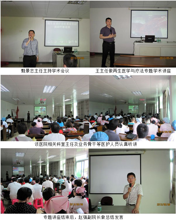 2013年12月6日上午8時(shí),中國燒傷創(chuàng)瘍雜志副總編輯、中國中西醫(yī)結(jié)合學(xué)會(huì)燒傷專業(yè)委員會(huì)常委兼秘書、北京美寶燒傷創(chuàng)瘍研究所副所長、臨床研究部主任王洪生研究員應(yīng)邀來到臺(tái)山市中醫(yī)院外科病房,在科主任和主管醫(yī)生的陪同下對(duì)多例創(chuàng)傷潰瘍、糖尿病足、靜脈淤血性潰瘍、皮膚癌、褥瘡、手術(shù)切口感染等住院患者進(jìn)行會(huì)診及教學(xué)查房。9點(diǎn)10分,來到門診大廳,開展專家義診活動(dòng)。11點(diǎn)左右,王主任不辭辛苦,在科主任和業(yè)務(wù)院長的陪同下再次來到外科病房,對(duì)兩例典型病例患者做教學(xué)式清創(chuàng)換藥。下午3點(diǎn),在該醫(yī)院學(xué)術(shù)會(huì)議廳再次舉辦了臺(tái)山市“皮膚再生醫(yī)療技術(shù)在慢性難愈性創(chuàng)面創(chuàng)面治療新進(jìn)展”專題講座,學(xué)術(shù)講座開始后,首先由該醫(yī)院創(chuàng)瘍血管外科主管醫(yī)生陳強(qiáng)做了“皮膚再生醫(yī)療技術(shù)在中醫(yī)院臨床運(yùn)用實(shí)踐和體會(huì)”的講座,隨后王主任做了專題為“皮膚再生醫(yī)療技術(shù)在慢性創(chuàng)瘍創(chuàng)面治療新進(jìn)展”的學(xué)術(shù)報(bào)告。會(huì)議由外科甑主任和趙付院長主持,中醫(yī)院及臺(tái)山各鄉(xiāng)鎮(zhèn)醫(yī)院領(lǐng)導(dǎo)和相關(guān)科室骨干150多名醫(yī)護(hù)人員參加了學(xué)術(shù)講座。王主任重點(diǎn)講述了1,我國著名生命科學(xué)家、醫(yī)學(xué)家徐榮祥教授近年來在人體再生復(fù)原科學(xué)研究領(lǐng)域所取得的重大臨床及實(shí)驗(yàn)研究成果,以及再生復(fù)原療法的概念及其解決難愈性創(chuàng)面治療的機(jī)理;2,介紹了再生復(fù)原療法創(chuàng)面規(guī)范的處理方法 ;3,重點(diǎn)講述了再生復(fù)原療法在各類難愈性創(chuàng)瘍創(chuàng)面治療要點(diǎn)及典型病例介紹,并結(jié)合大量的病例圖片講解了各類深度燒傷創(chuàng)面、再生醫(yī)療技術(shù)在骨外露、鋼板外露、糖尿病足、動(dòng)脈閉塞癥、撕脫傷、斷肢再生、手術(shù)切口感染、褥瘡等各種難愈合創(chuàng)面的治療過程及要點(diǎn)。學(xué)術(shù)報(bào)告持續(xù)到6點(diǎn)才結(jié)束。學(xué)術(shù)講座結(jié)束后,主管副院長趙強(qiáng)做了總結(jié)發(fā)言,會(huì)后,該醫(yī)院院長陳誼武親自到會(huì)對(duì)王主任表示感謝,他還特別強(qiáng)調(diào),2003年他曾經(jīng)到廣州參加皮膚再生醫(yī)療技術(shù)學(xué)習(xí)班,今天聽到的和看到的是該項(xiàng)技術(shù)又在慢性難愈性創(chuàng)面有了那么多新進(jìn)展,本次學(xué)術(shù)交流非常有意義,之后王主任應(yīng)邀與陳誼武、院長、趙強(qiáng)副院長、創(chuàng)瘍血管外科主任甄景志等領(lǐng)導(dǎo)、專家合影留念。通過本次,義診、教學(xué)查房、會(huì)診、學(xué)術(shù)講座臺(tái)山市電視臺(tái)等新聞媒體全程進(jìn)行了采訪報(bào)道,起到了在臺(tái)山市進(jìn)一步深入推廣、普及皮膚再生醫(yī)療技術(shù)的作用。