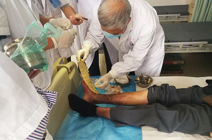 9月25日,中國中西醫(yī)結(jié)合學(xué)會燒傷專業(yè)委員會金黨軍教授來到黃岡市中心醫(yī)院腫瘤科,對該科骶尾部壓瘡患者進會診,該科護士長尹志紅將患者情況與金教授進行了交流,同時金教授對整個換藥流程進行示范演示。換藥后金教授與護士長等人對再生技術(shù)進行了更深入交流探討,為今后再生技術(shù)在該科室更好推廣奠定基礎(chǔ)。