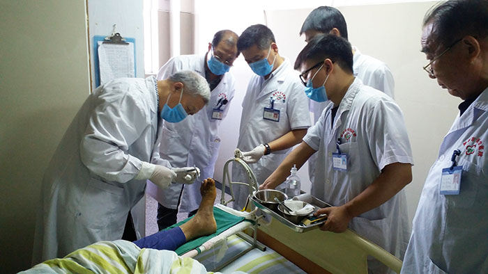 長安醫(yī)院李斌院長、王錫印副院長、醫(yī)務(wù)科石濤主任、余凱主任熱情接見交流,雙方就發(fā)展創(chuàng)面修復(fù)科進行了探討,并交換了意見。李斌院長表示重點支持,并責(zé)令王院長主抓此項工作。會后,金教授一行來到科室,在周魏峰主任的帶領(lǐng)下,金教授對壓瘡患者和糖尿病患者進行了會診,并應(yīng)用再生醫(yī)療技術(shù)為患者進行了規(guī)范換藥示范操作,并對換藥過程中需要注意的事項進行了詳細講解。