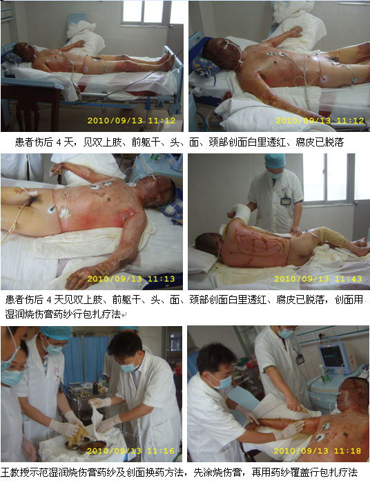為確保對該患者的成功救治,王教授又于2010年9月28日再次到惠陽區(qū)第一人民醫(yī)院指導(dǎo)對該患者的救治工作,并深入病房,親自為患者清創(chuàng)換藥,指導(dǎo)主管大夫如何規(guī)范處理患者液化期III度創(chuàng)面的壞死組織和清創(chuàng)方法。