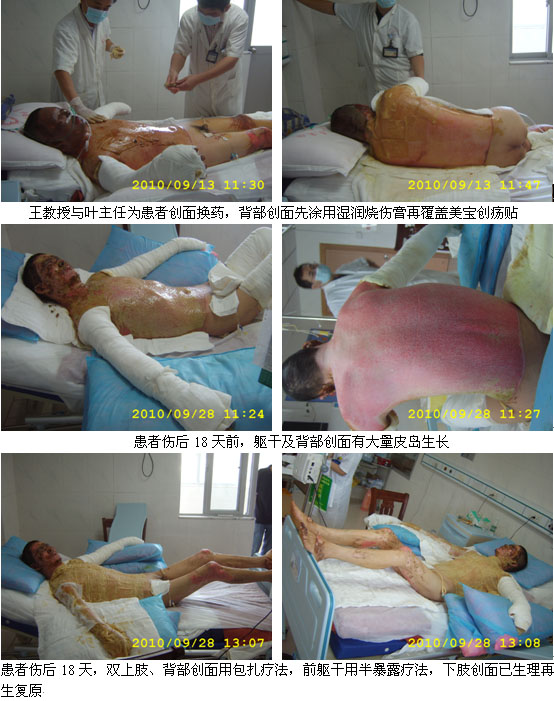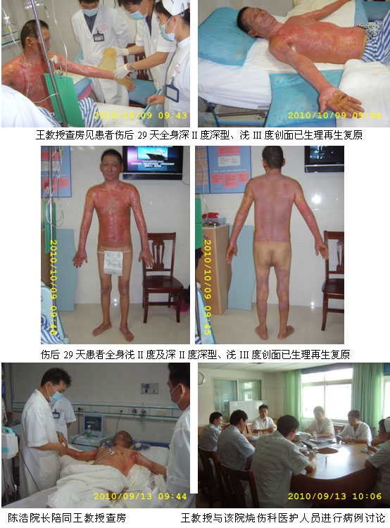 2010年10月9日,對惠陽區(qū)第一人民醫(yī)院燒傷整形手足顯微外科和他們收治的這例大面積深度燒傷患者來說,都是值得慶祝的日子,經(jīng)過該科醫(yī)護(hù)人員30多個(gè)夜以繼日的精心治療,該患者深度燒傷創(chuàng)面未進(jìn)行切、削痂植皮,全程應(yīng)用燒傷皮膚原位再生復(fù)原技術(shù)治療創(chuàng)面,實(shí)現(xiàn)了皮膚組織器官的原位再生復(fù)原,避免了殘疾。當(dāng)日上午9時(shí),王洪生教授再次來到惠陽區(qū)第一人民醫(yī)院,在該院陳浩院長以及燒傷手足顯微外科葉琪毅主任陪同,深入燒傷病房為患者查房,指導(dǎo)醫(yī)生對患者創(chuàng)面康復(fù)期的治療,并為剛剛收治的1例燒傷總面積達(dá)45%TBSA的深度燒傷患者進(jìn)行了會(huì)診和指導(dǎo)。