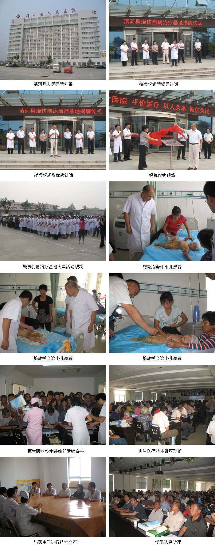 2010年9月15日,清河縣人民醫(yī)院迎來了建院62周年和燒傷創(chuàng)瘍基地醫(yī)院掛牌雙喜臨門的好日子。中國中西醫(yī)結(jié)合學(xué)會(huì)燒傷專業(yè)委員會(huì)河北區(qū)辦事處主任王琳琳及辦事處的工作人員陪同中國中西醫(yī)結(jié)合學(xué)會(huì)燒傷專業(yè)委員會(huì)委員樊兆宗教授參加了慶典活動(dòng)和燒傷創(chuàng)瘍治療基地的掛牌儀式。清河燒傷創(chuàng)瘍治療基地被稱作是一項(xiàng)造福百姓的民生工程,從基地籌備到成立都受到了縣委縣政府、衛(wèi)生局領(lǐng)導(dǎo)的高度重視和大力支持。上午九點(diǎn)慶典活動(dòng)正式開始,縣領(lǐng)導(dǎo)和衛(wèi)生局領(lǐng)導(dǎo)先后致賀詞,對清河縣人民醫(yī)院62年來取得的成績給予了肯定,對燒傷創(chuàng)瘍治療基地的成立表示衷心祝賀,對再生醫(yī)療技術(shù)給予了高度贊揚(yáng),同時(shí)希望醫(yī)院通過這項(xiàng)民生工程造福更多的患者。參加這次慶典活動(dòng)的相關(guān)部門領(lǐng)導(dǎo)及醫(yī)務(wù)人員共500余人,當(dāng)?shù)仉娨暸_(tái)為此進(jìn)行了全程報(bào)道。