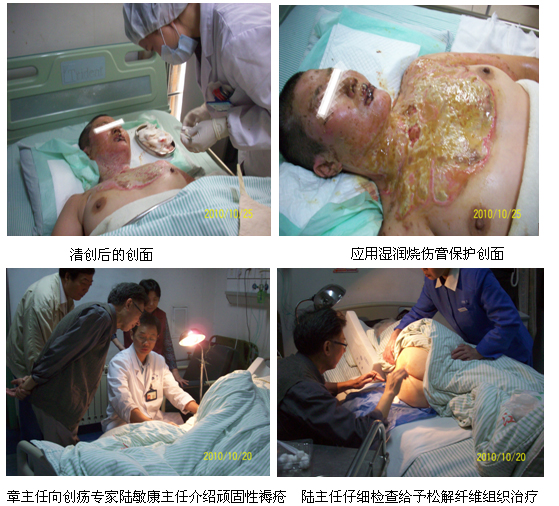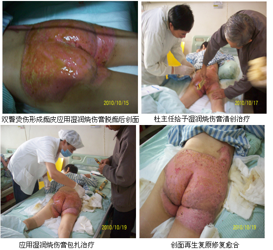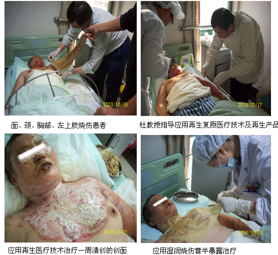 2010年10月9日,在南京舉辦了各大醫(yī)院燒傷整形科高級醫(yī)療人員座談會后,江蘇省人民醫(yī)院燒傷整形科率先在臨床推廣應用再生醫(yī)療技術及再生系列產(chǎn)品治療燒傷患者3名,應用創(chuàng)瘍貼治療褥瘡患者1名。在應用再生醫(yī)療技術治療兩周后,其中1名燒傷患者以痊愈出院,另1名患者大部分燒傷創(chuàng)面已愈合,部分深II度~淺III度創(chuàng)面組織生機良好?;颊邞迷偕t(yī)療技術換藥治療時,創(chuàng)面“不疼痛、不出血、創(chuàng)面不存留液化物和壞死組織”(即創(chuàng)面治療三不原則),深受醫(yī)生護士和患者及家屬的歡迎,達到了推廣再生復原醫(yī)療技術地目的。
